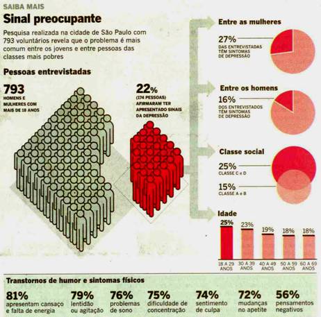 “Os números da OMS mostram claramente que o peso da depressão (em termos de perdas para as pessoas afetadas) vai provavelmente aumentar, de modo que, em 2030, ela será sozinha a maior causa de perdas (para a população) entre todos os problemas de saúde”, afirmou à BBC o médico Shekhar Saxena, do Departamento de Saúde Mental da OMS.